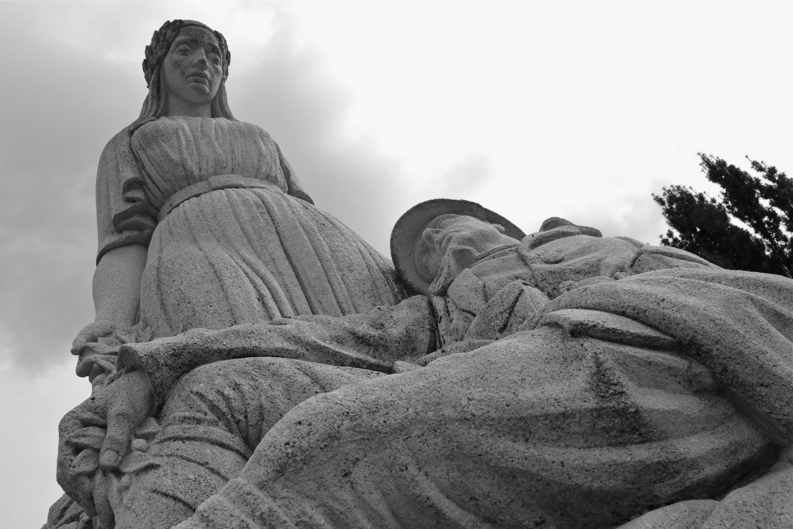 Le monument aux morts de Conches-en-Ouche trône majestueusement au milieu d’un parc. Il représente une femme debout, les mains ouvertes, pleurant un Poilu mourant. Il rend hommage aux morts de la commune ainsi qu’à leur famille, dévastée par la tristesse.